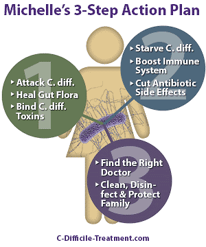 The 3 Step Action Plan in Chapter 1 of your book, C. difficile Treatments & Remedies, will show you the most important things to do first. Below is a summary of the 3 Step Action Plan, along with links to specific remedies, methods and resources that will help you carry out the Action Plan.